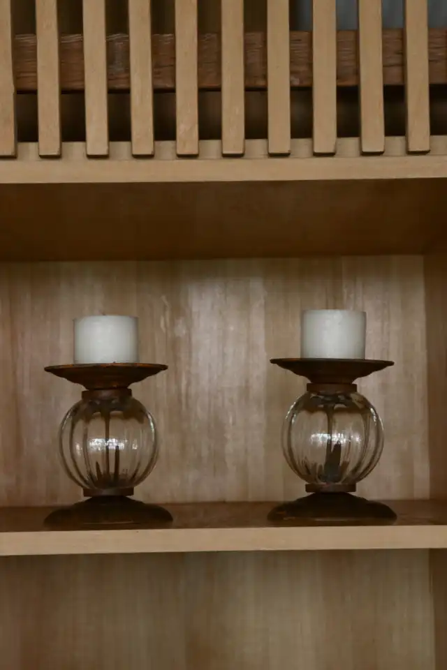 candelabro de hierro color oxido y esfera de vidrio. Juego con vela Moira