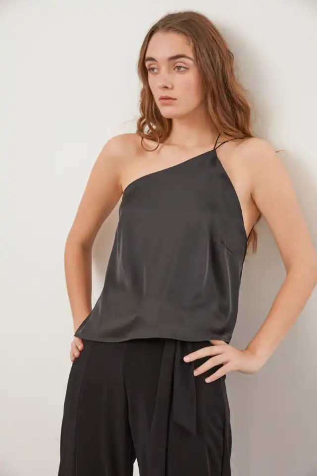 Top de noche de 1 hombro, asimetrico con espalda tipo buche. Confeccionada en saten 97% poliester 3% spandex. Largo T1: 45cm (el lado
