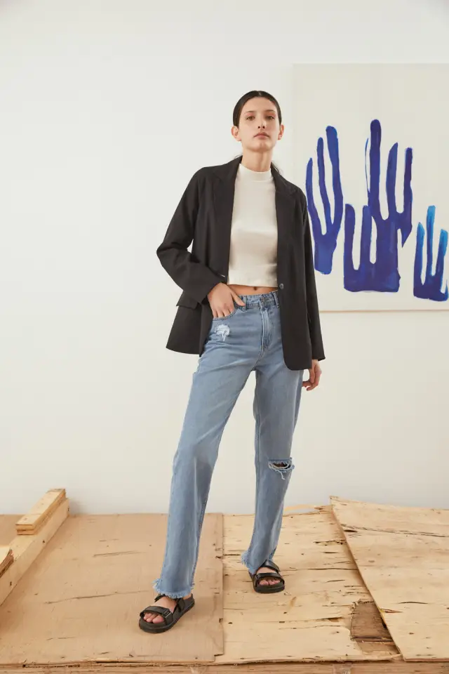 Blazer sastrero oversize, recto sin pinzas. Confeccionado en 90% rayon, 10% poliester.
