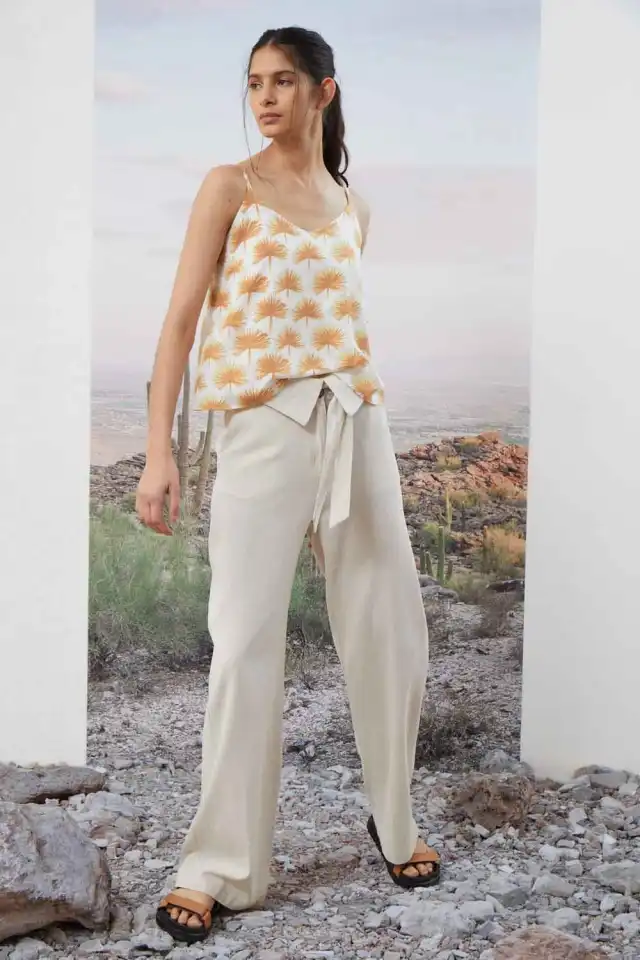 Top escote V confeccionado en 97% rayon 3% spandex. Lleva breteles regulables, su largo es por encima de la primera cadera. Largo t3: 62cm.
