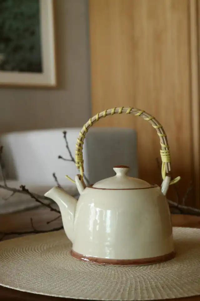 tetera de cerámica con manija de mimbre (sin infusor) medidas aprox. 8cm altura x 13 cm diámetro