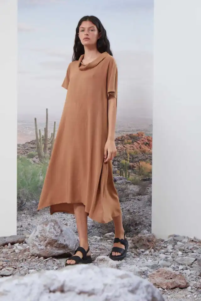 Vestido midi con tajo lateral confeccionado en símil lino 100% rayon. Posee un cuello tipo bote embolsado y mangas cortas. Su largo espalda tiene una pequeña redondes que lo convierte un poco mas largo que en el delantero.