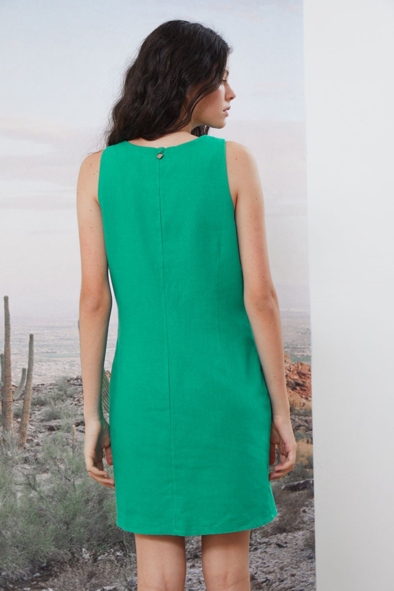 Vestido de corte jackie confeccionado en 55% lino 30% rayon 10% poliester y 5% algodón. Posee un