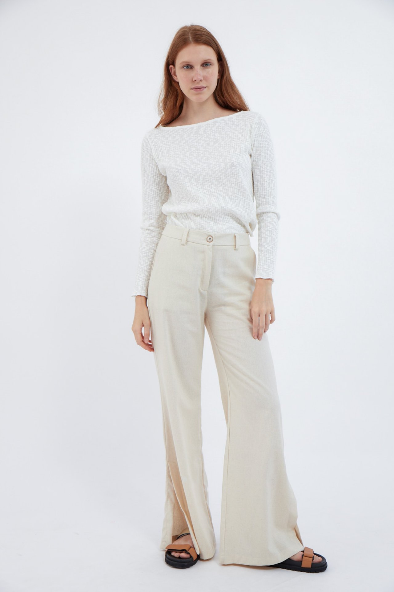 Palazzo de lino con aberturas a los cotados y bolsillos plaque. Confeccionado en lino 55% y 45% rayon. Largo t4: 112cm.