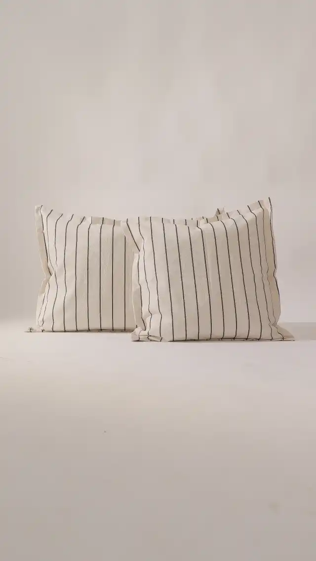 Almohadón rayado de 50cm x 50cm. El almohadón es grande, cuenta con dos versiones una de rayas en gris claro y otra de rayas en gris oscuro.