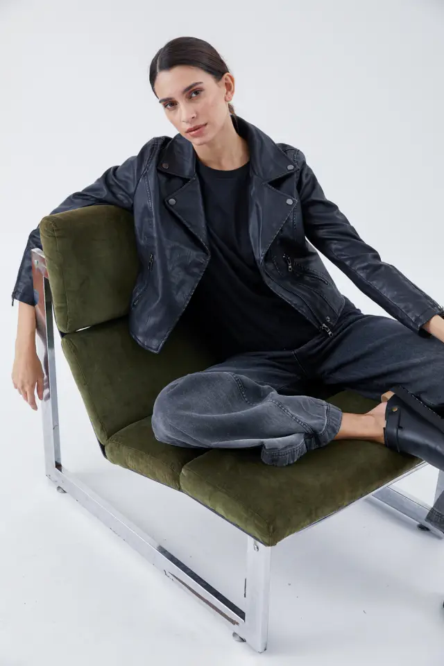 Campera tipo motoquera confeccionada en PU. Su calce es a la primer cadera, posee cierres metálicos negros en delantero, bolsillos y puños. Es un modelo al cuerpo.