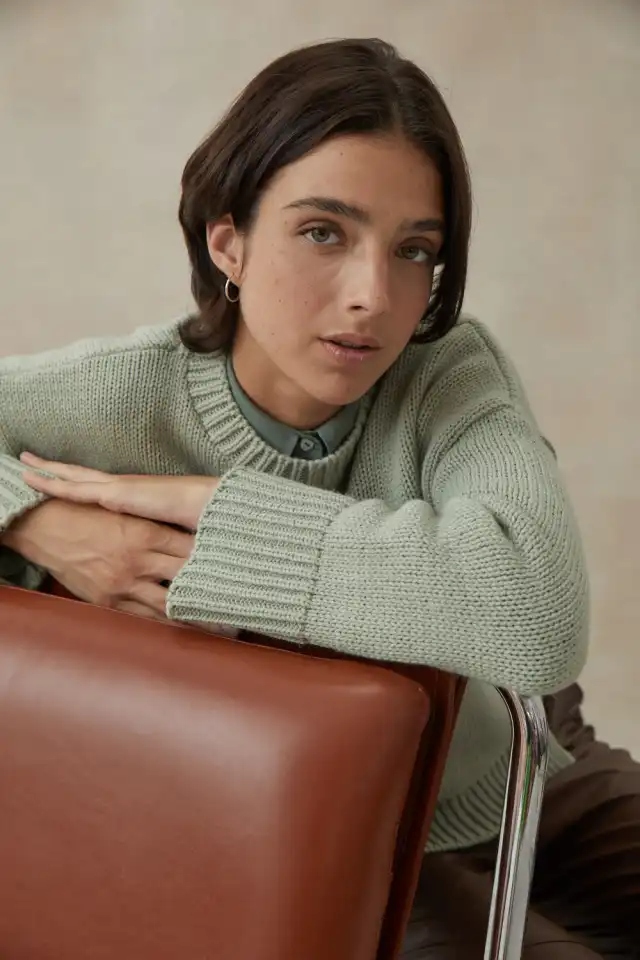 Sweater de cuello redondo. Si bien su silueta es holgada, la tabla de talles viene del 1 al 3. Esta confeccionado en acrilico 100%. Cuenta con ruedos en morley anchos, tanto mangas como cuerpo de la prenda. Dos tajos en los laterales. Sweater abrigado que permite el uso de otras prendas por debajo y terceras pieles por encima.