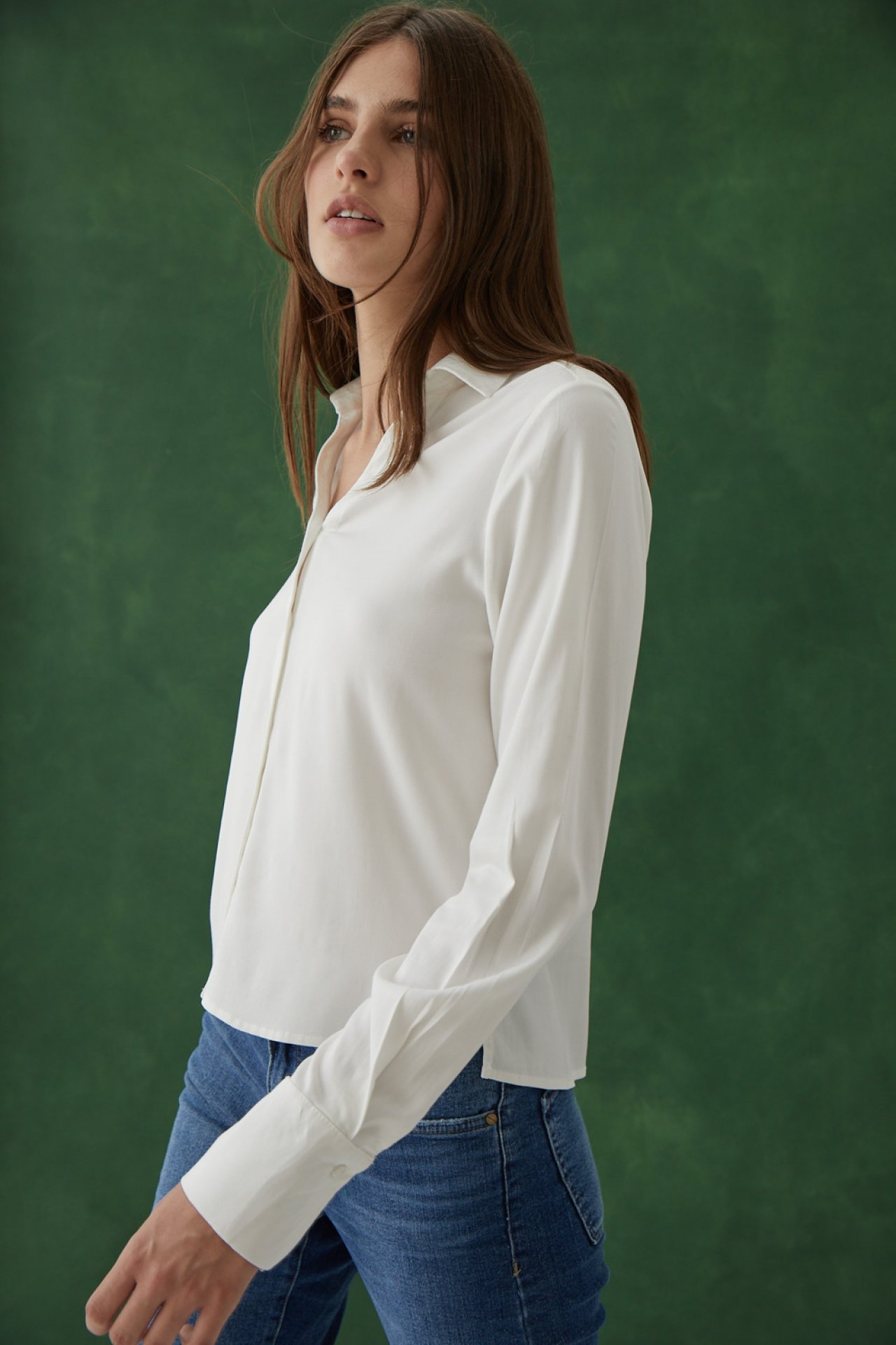 Camisa confeccionada en 97% rayon 3%spandex. Posee escote en V con cartera con botones al tono. Su largo es a la primer cadera. Posee detalle de doble boton en puño y tajo para mayor apertura.