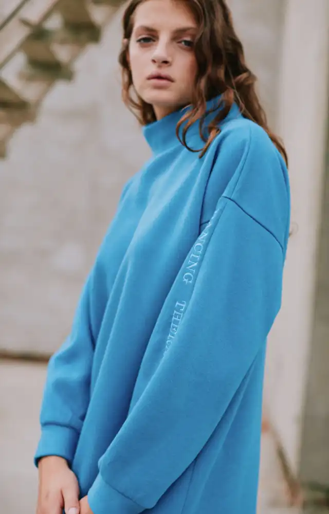 Buzo de friza con cuello madia polera color azul verdoso, confeccionado con 50% ALGODÓN 50%