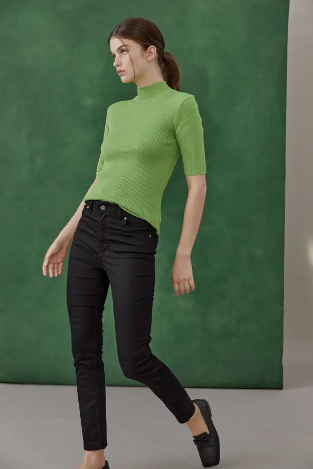 Jean clásico tiro alto 5 bolsillos confeccionado en gabardina de sarga suave de 98% algodón 2% elastano. Su calce es chupin, de lavado estatico y pespuntes al tono