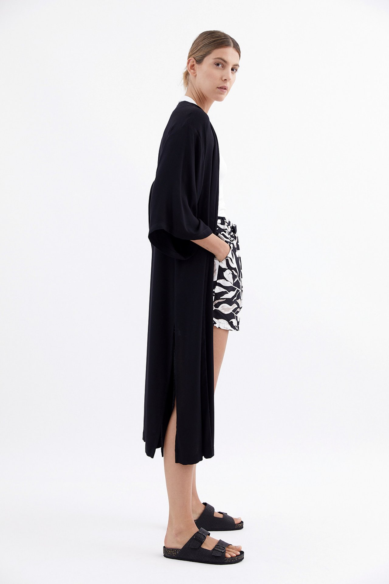 Kimono midi de mangas 3/4 con tajos a los costados. Calce tipo oversize. Confeccionado en crepe de 100% rayon. Largo t1: 115cm