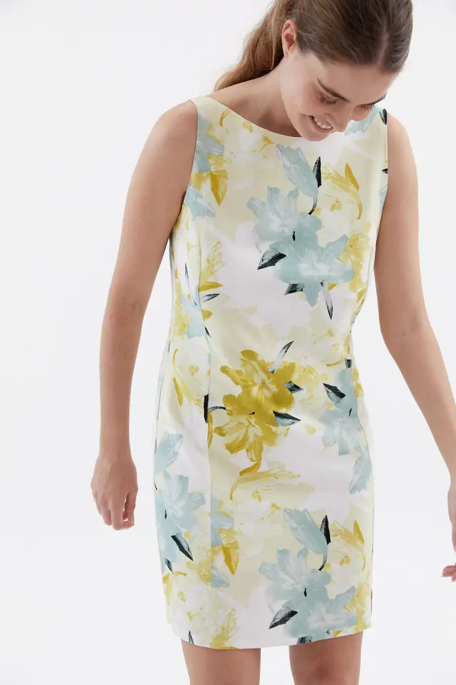 Vestido de corte jackie confeccionado en 55% lino 45% rayon. Su largo es por encima de la rodilla. Lleva escote tipo bote, escote rendondo en espalda y, en el delantero, un pequeño tajo a la altura de la pinza de entalle. Su largo de referencia para el talle 2 es de 86cm.