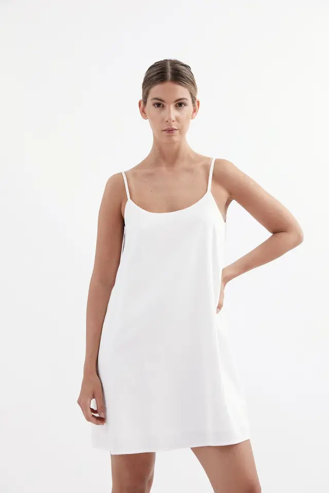 Vestido corto confeccionado en 98% algodón 2% poliéster. Embolsado con forrería 100% rayon.