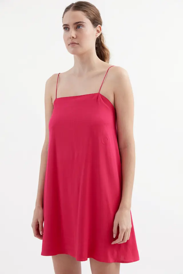 Vestido con escote cuadrado, de breteles finitos elásticos, forrado. Confeccionado en crepe 100% rayon. Su largo de referencia para t2 es de 83cm.