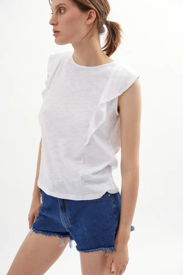 Remera fabricada en genero de punto, algodón flamé 60% algodón 40% poliester. De silueta regulat fit (cuadrada que no se ajusta al cuerpo), esta remera cuenta con volados de la misma tela, que a su vez, funcionan como mangas para tapar el hombro. Cuello redondeado. Largo total de la Subinforme Curva de Talles y Cantidades prenda de hombro a ruedo: