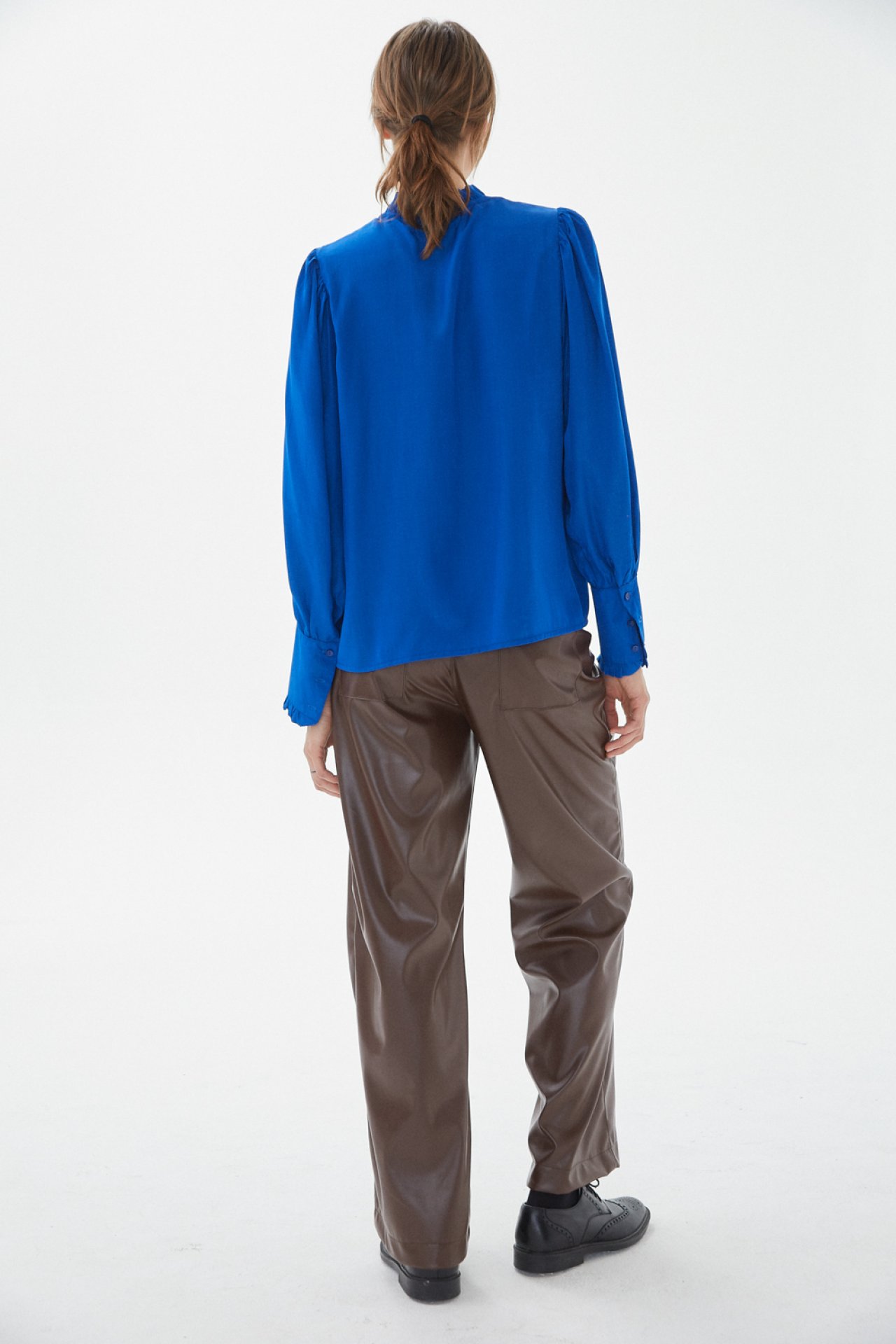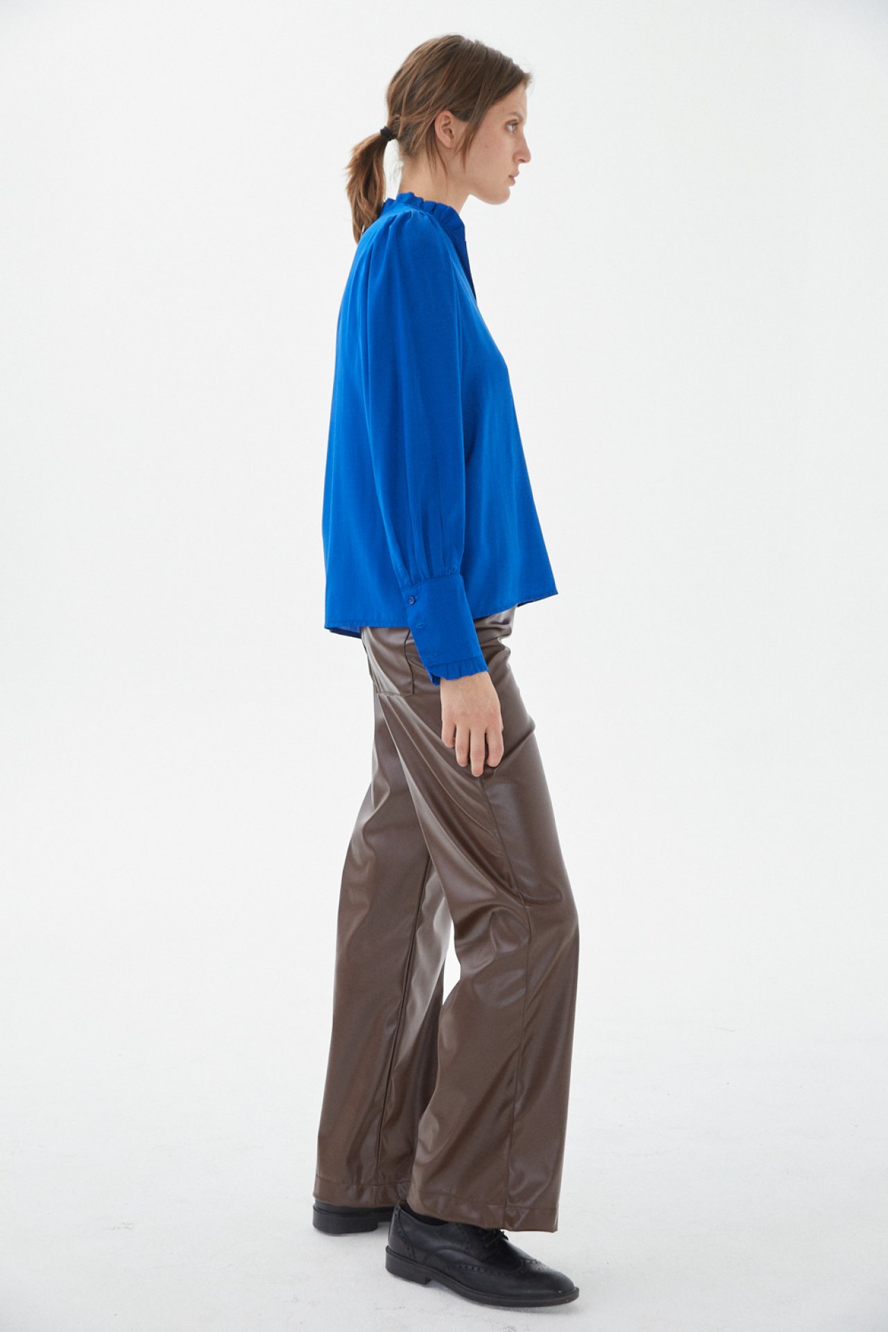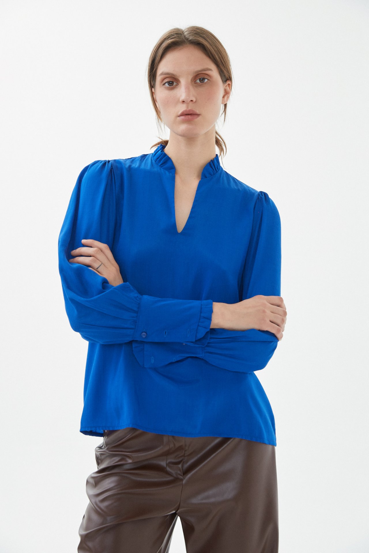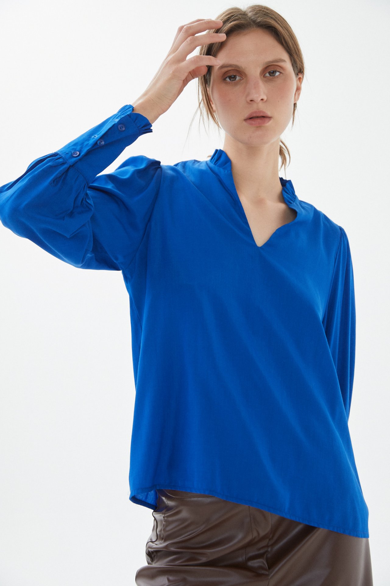 Blusa de estilo romántica confeccionada en 90% poliester 10% rayon. Posee escote V con vista interna, cuello con volado y puños anchos con frunce para generar volumen y volado en el ruedo con botones al tono. En copa de manga lleva frunces suaves para mayor volumen. Su largo de referencia para el talle 2 es de 61cm