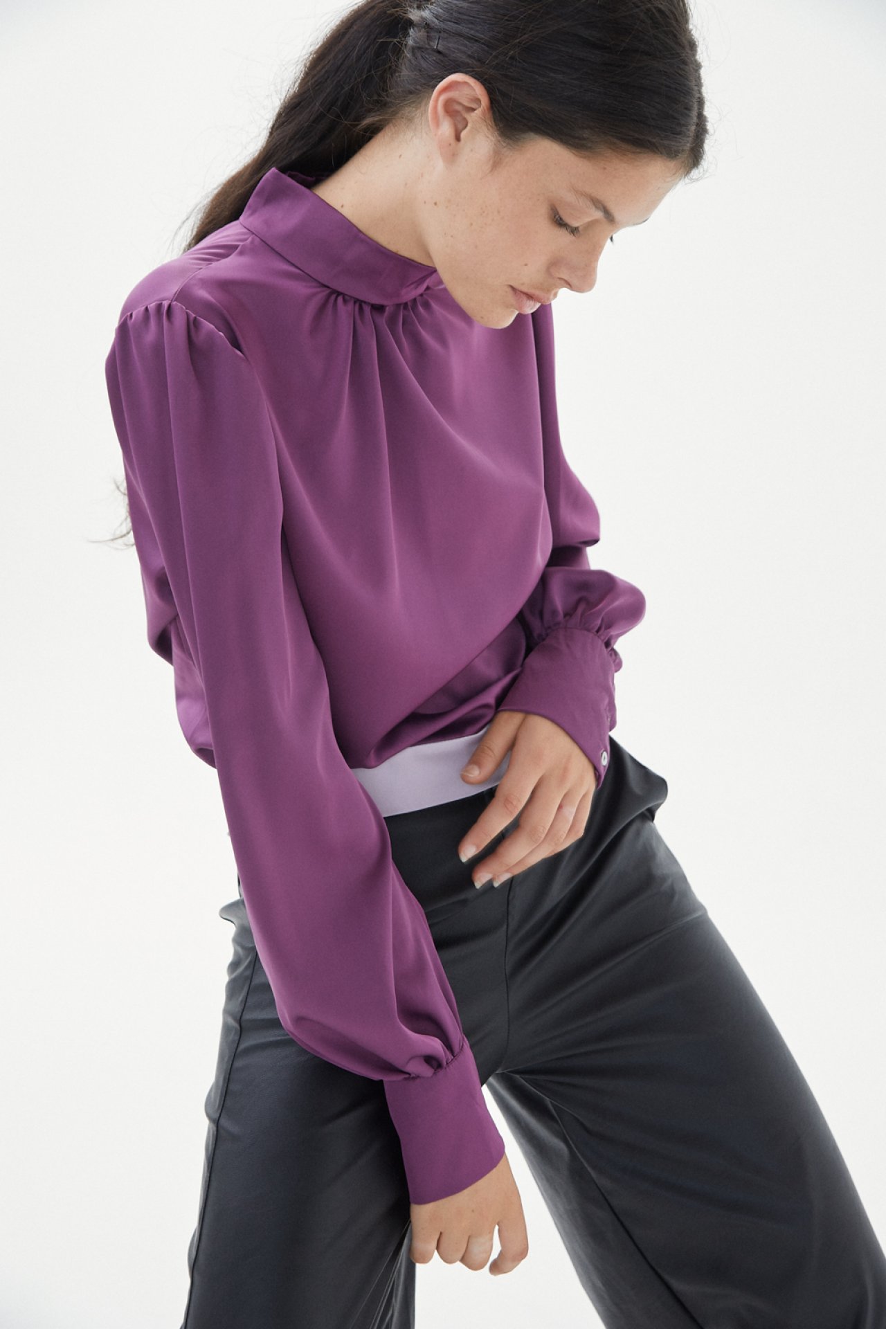 Blusa de noche con mangas globo y espalda abierta con lazo. Confeccionada en saten de algodón. Su largo de referencia para el talle 1 es de 47cm.