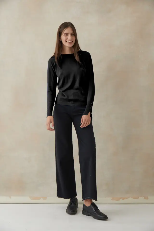 Sweater con escote redondo, mangas al cuerpo y calce semi ajustado. Prenda ideal para estar cómoda y canchera. Tiene una cartera de botones metálicos en los puños y una tajo que lo hace muy distinguido. Esta prenda es tejida en 70% Viscosa 30% Poliamida. Su largo es regular, llegando a la primera cadera. Medida del largo: 60cm.