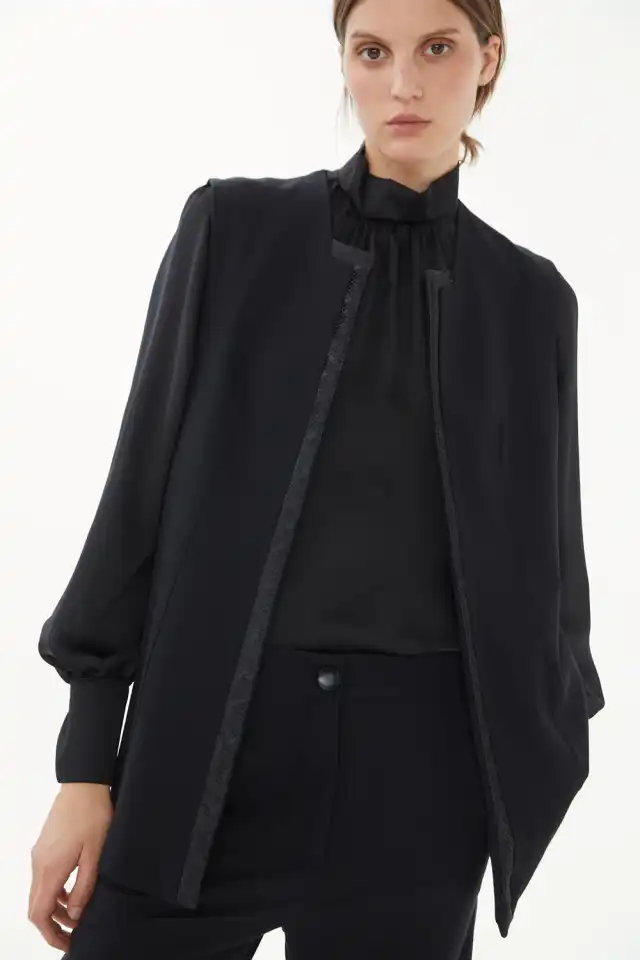 Chaleco largo con un zocalo frontal en simil cuero reptil. Confeccionado en textil sastrero de 75%