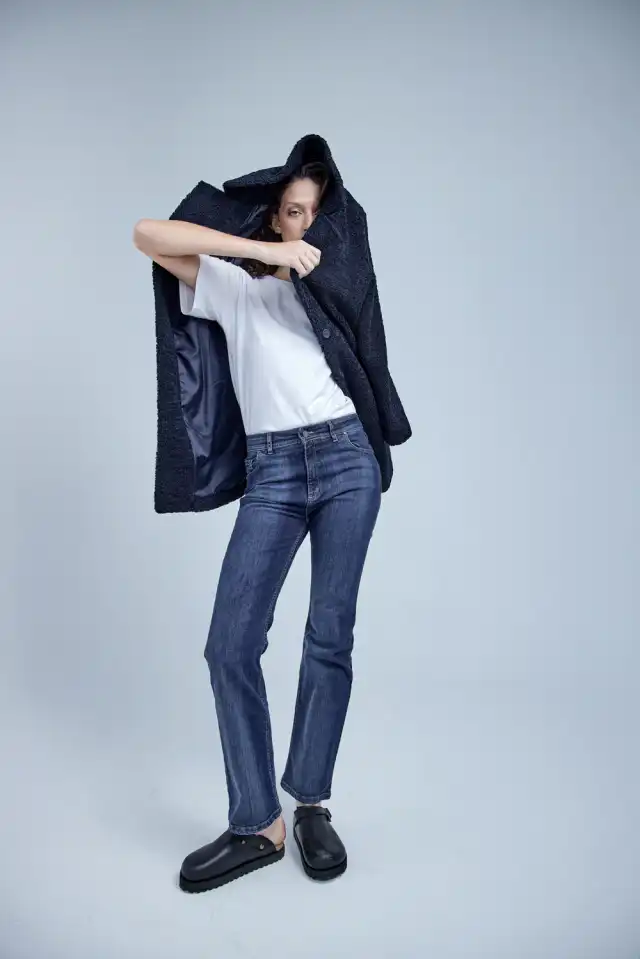 Jean tiro alto 5 bolsillos confeccionado en 98% algodón 2% elastano. La tela tiene look rígido,