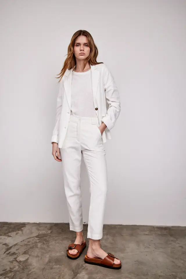 Posee 4 bolsillos; 2 en el delantero y 2 ojal en la parte trasera. Confeccionado en 55% lino 30% rayón 10% poliéster 5% algodón. Su largo total