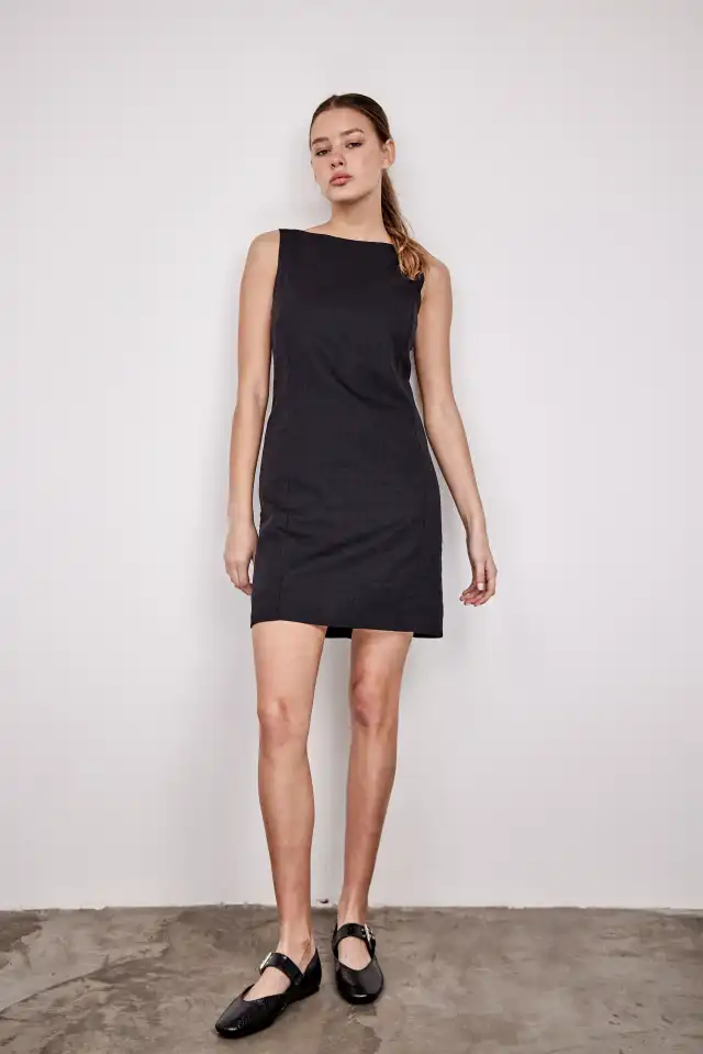 Vestido tipo jackie confeccionado en 70 % rayon y 30 % lino. Su largo es corto, por