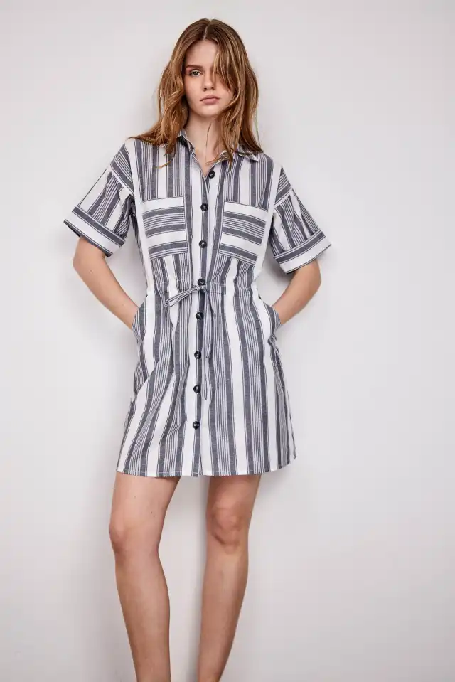 Vestido corto camisero confeccionado en 70% algodón 20% lino y 10% rayon. Posee