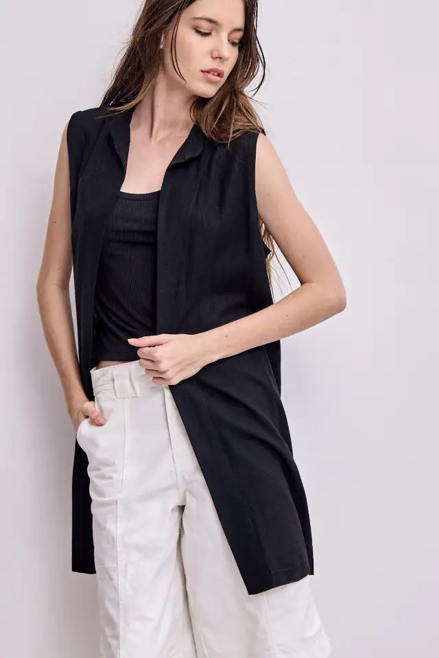 Chaleco largo confeccionado en un blend 55% lino 45% rayon.