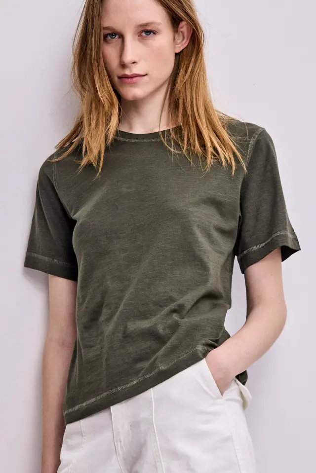 prenda queda relajada. Tiene un recurso de costuras bordadas, en escote, sisa y