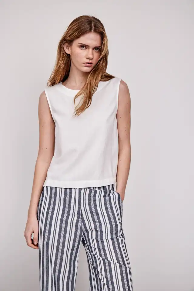 Top sin mangas confeccionado en 55 % lino y 45 % rayon. El modelo viene en dos