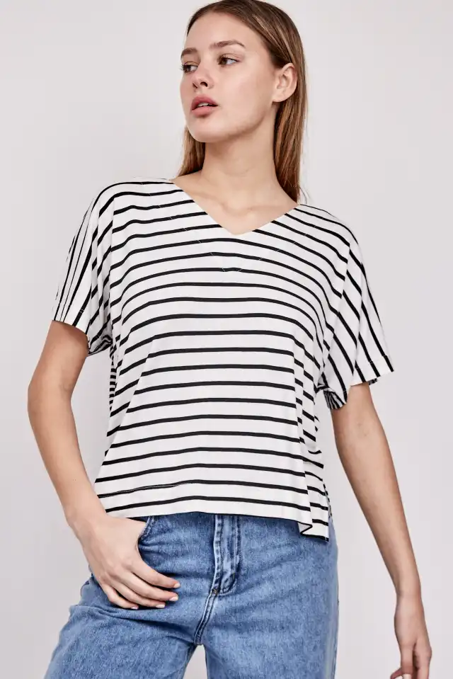 trasero raya navy blanca y negra. Escote en V, con ruedo ancho y