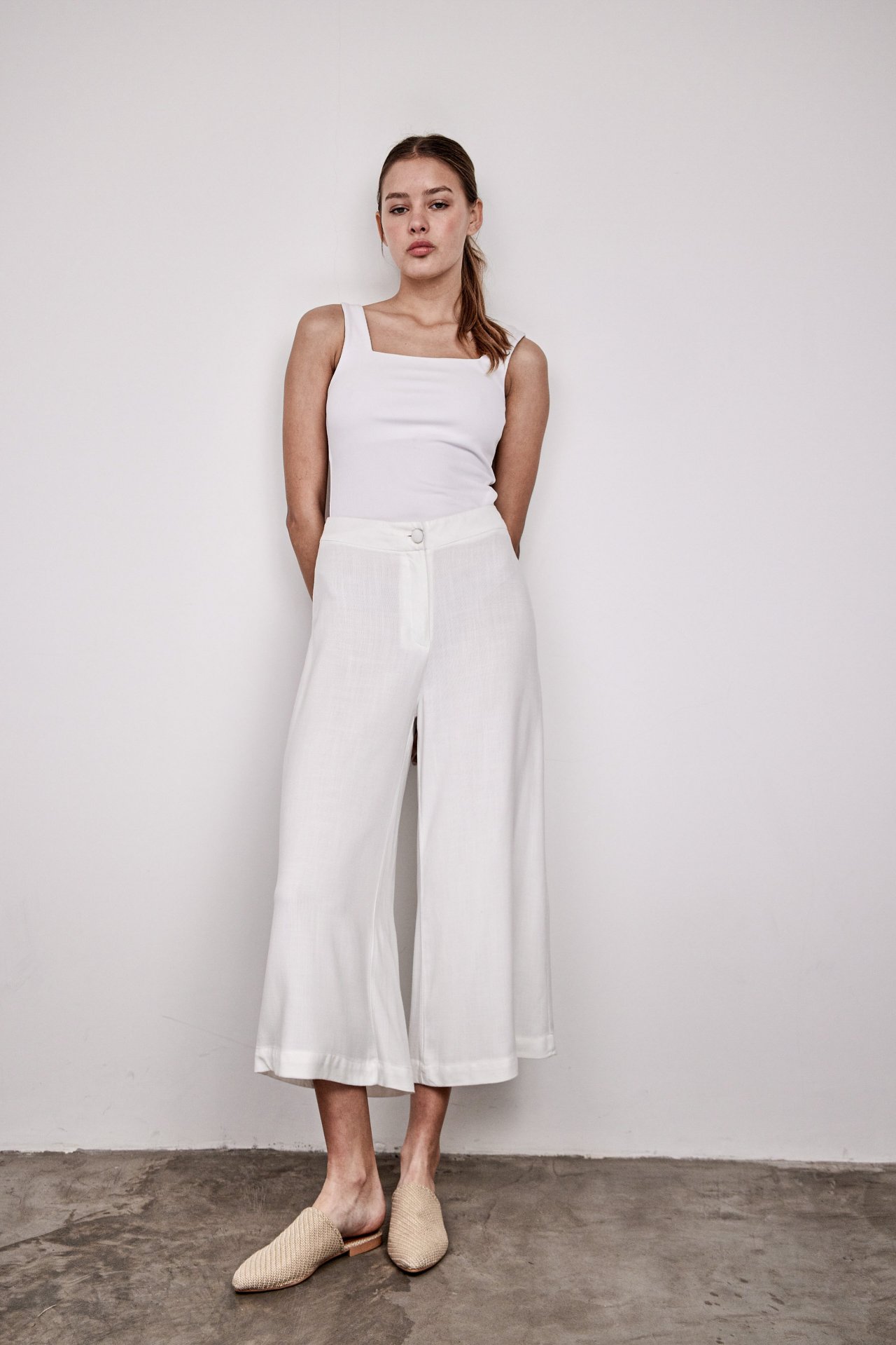 Pantacourt confeccionado en 100% rayon con textura simil lino. Posse cintura con cierre invisible en lateral y bolsillos ojal en trasero. En delantero, lleva dos pinzas y su largo total de tiro hasta el ruedo para el talle 2 es de 57cm