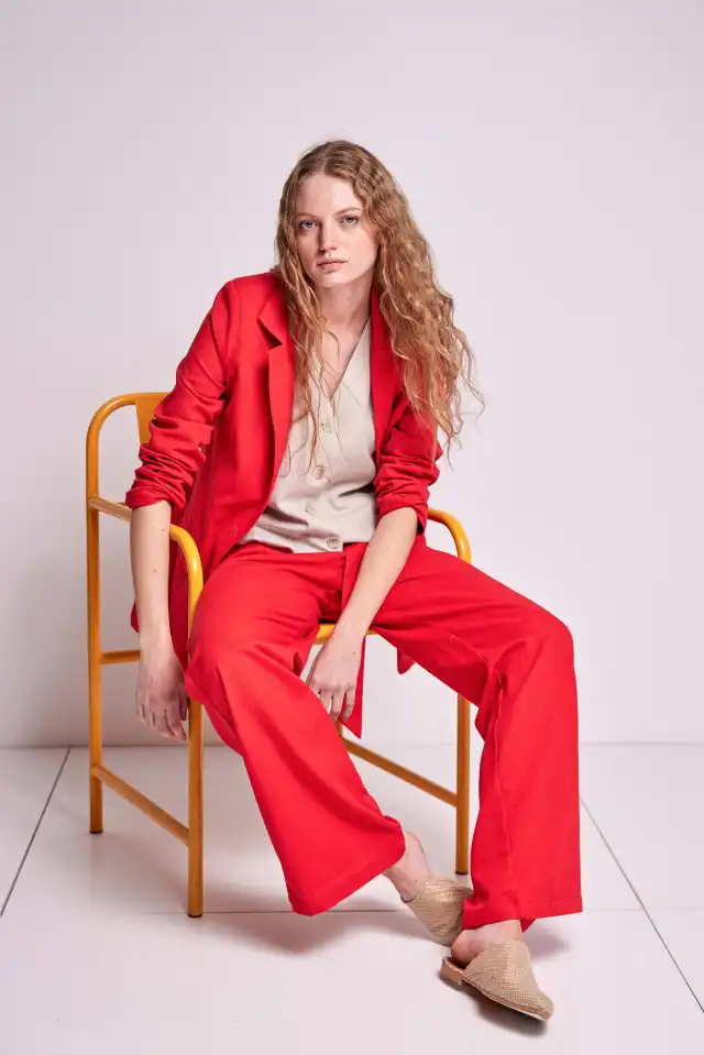 calce entallado. En variante roja posee botones a contratono y en variante