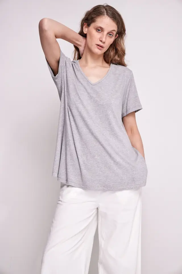 remera fabricada en género de punto, morley compuesto por 93% rayón y 7% spandex. De molderia holgada, esta prenda cuenta con mangas regulares y cuerpo amplio no se adhiere al cuerpo. Cuenta con un escote en V y tiene dos pequeños tajos laterales. Largo total de hombro a ruedo: 65 cm