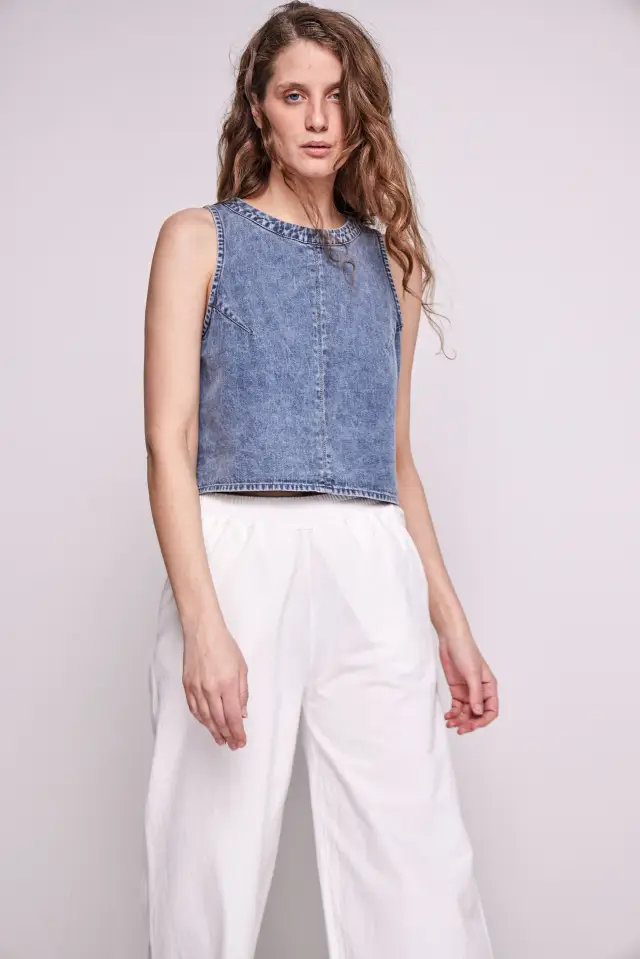 Top sin mangas de escote redondo, pespunteado en camel, a