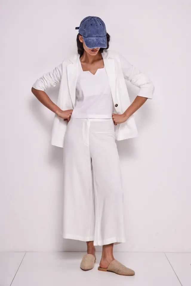 45 % rayon, 30% poliester, 20% lino y 5 % algodón. El modelo viene en una sola variante y hace conjunto con un pantalón. El largo total de hombro a ruedo es de 51 cm en talle 1.