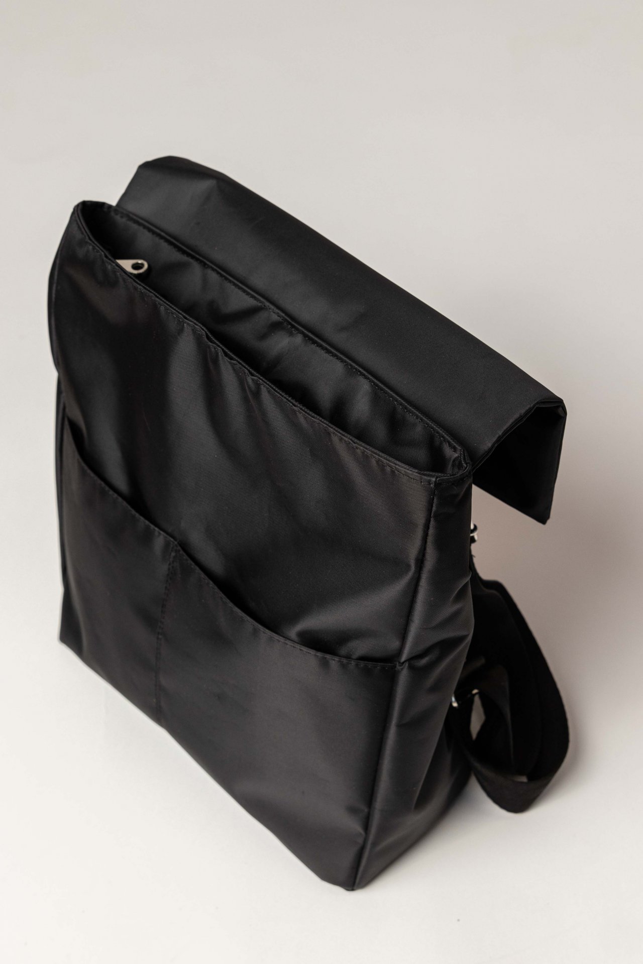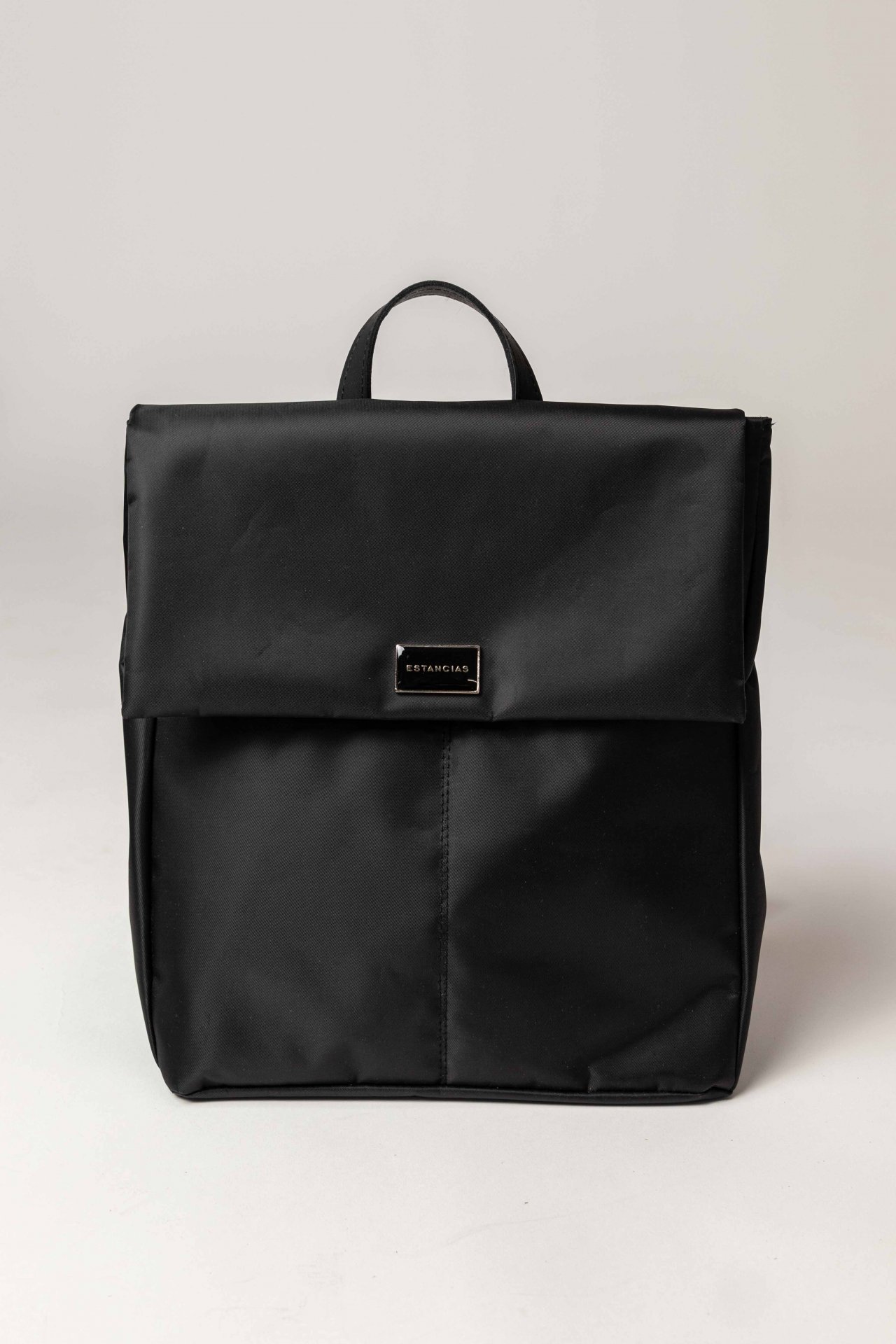 Mochila fabricada en genero Andorra. De silueta cuadrada, con una solapa en el acceso a la mochila y dos bolsillos plaque