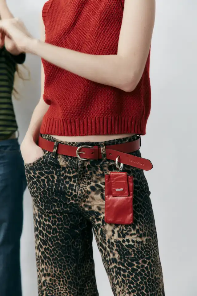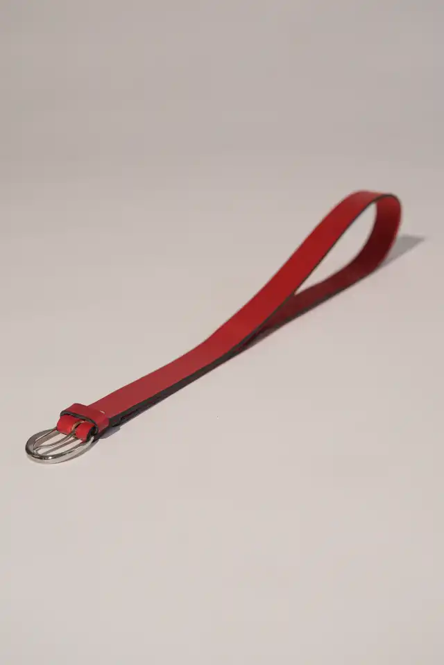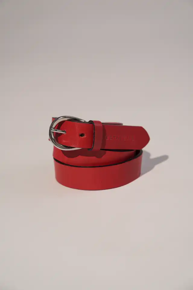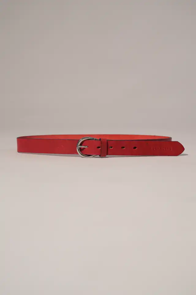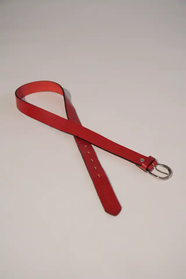 Cinturón rojo de cuero con hebilla de níquel.