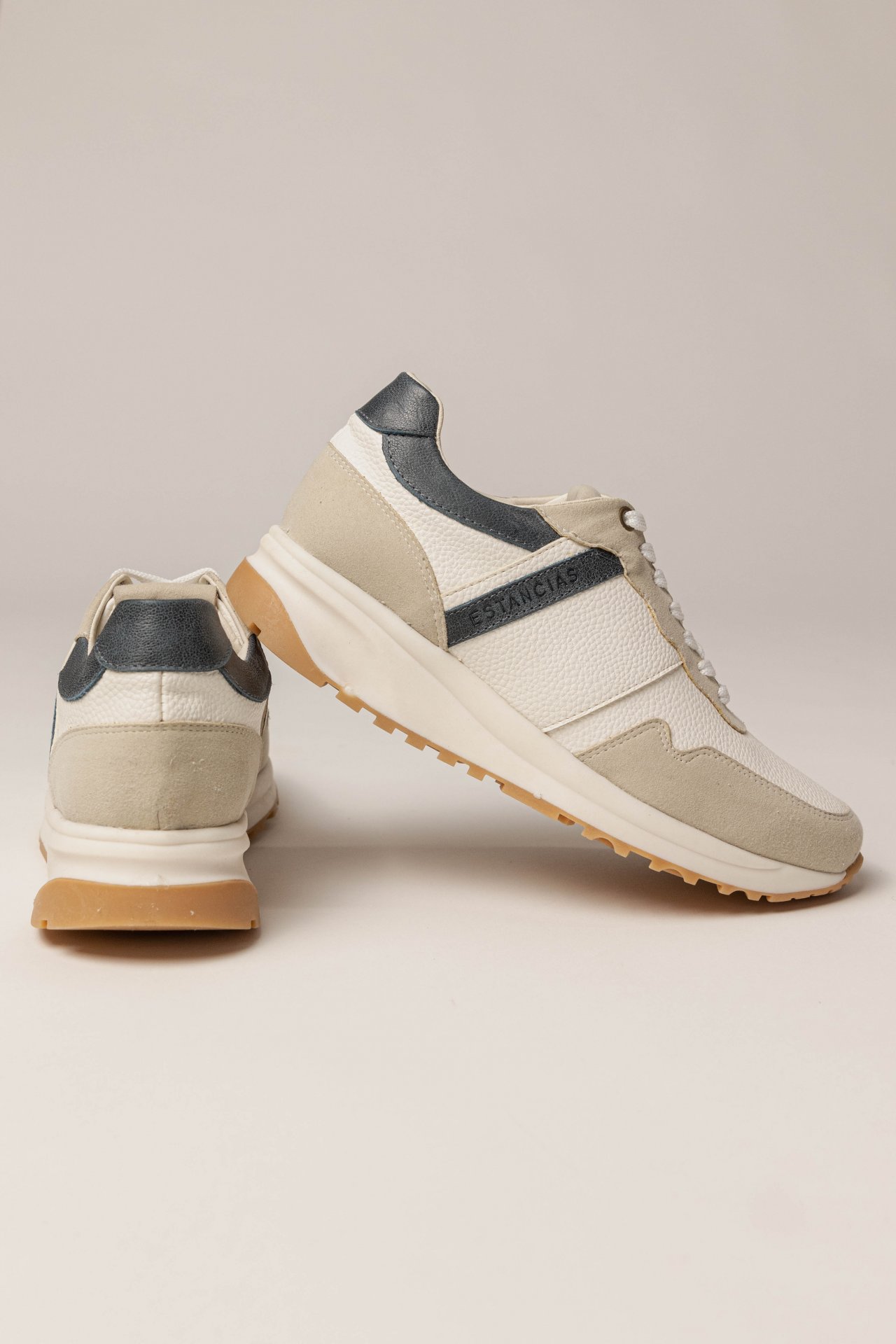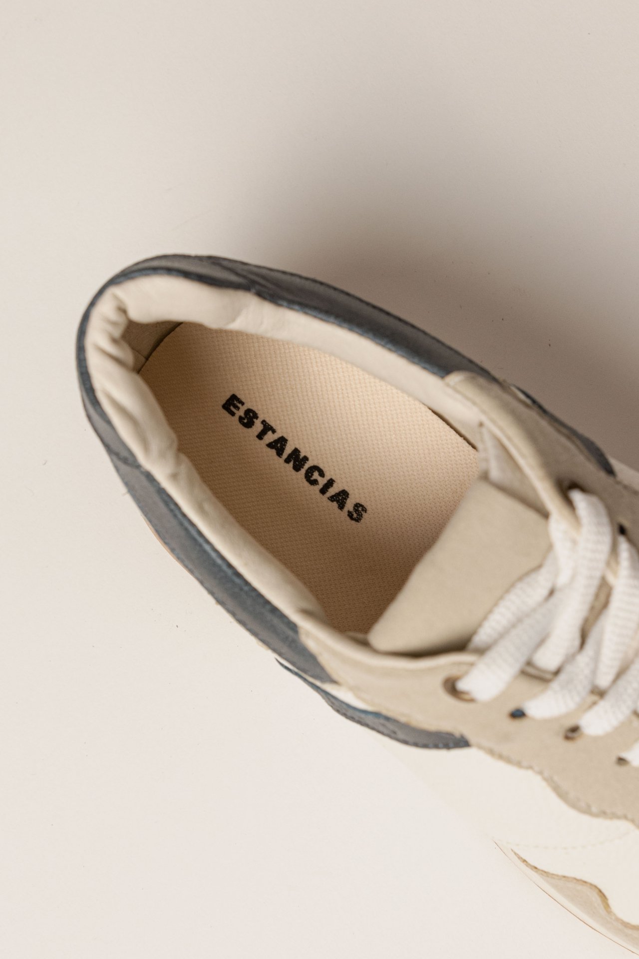 Zapatilla de cuero combinada con detalles en azul. Disponible desde el talle 36 al 40.
