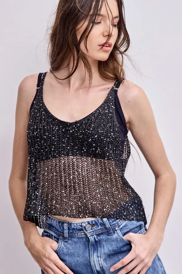 Musculosa tejida de lurex con lentejuelas. Disponible en dos talles y dos colores.