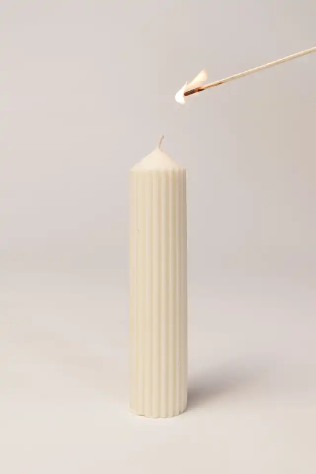 Vela por unidad de forma vertical con diseño, hecha con cera de soja y pabilo de algodón. De 18*4cm