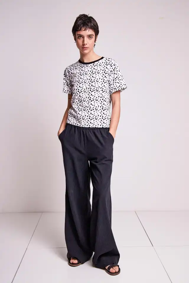 se adhiere al cuerpo. Este textil esta estampado con un diseño de pintitas negra a