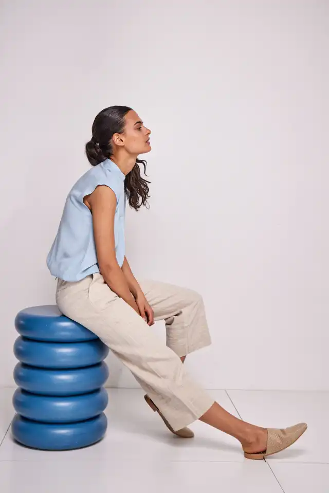 Pantacourt de lino rayado con recorte en la botamanga a contra hilo, bolsillos frontales diagonales y ojales en su parte trasera. Confeccionado en un blend de lino 70% viscosa 18% lino 12% algodón. Su largo total de tiro hasta el ruedo para el talle 2 es de 58cm.