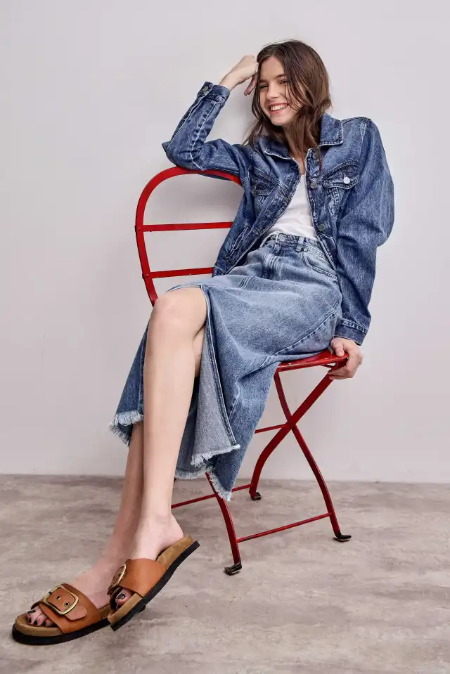 Falda 5 bolsillos confeccionada en denim 100% algodón, liviano y fresco. Su lavado es