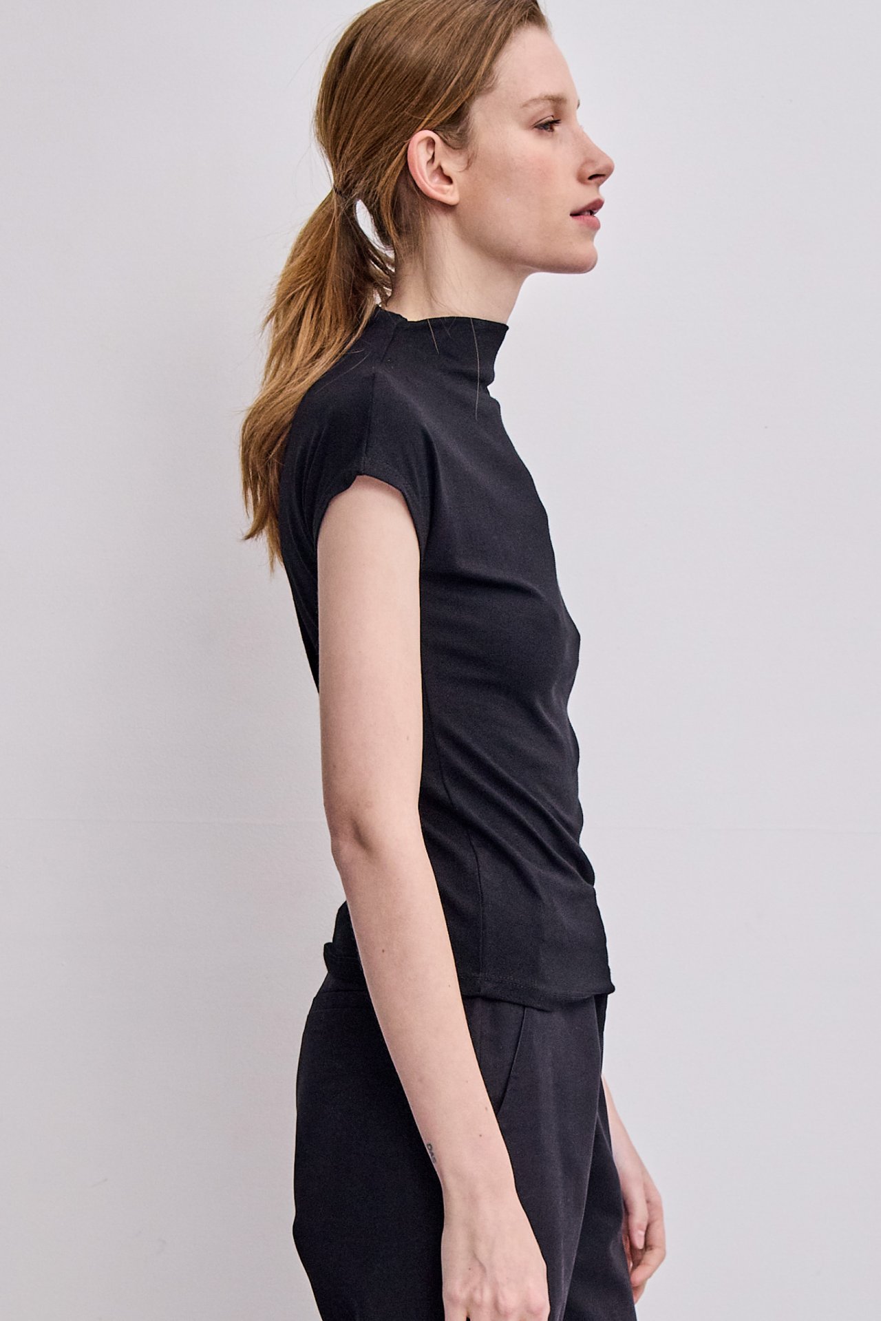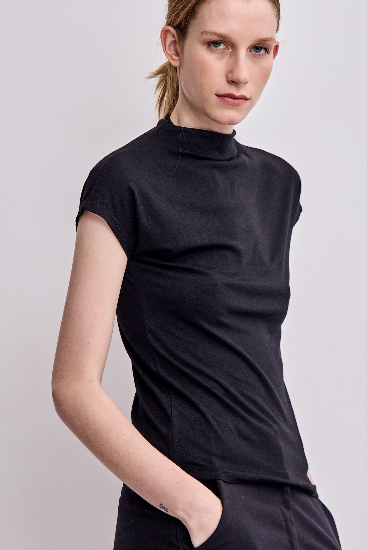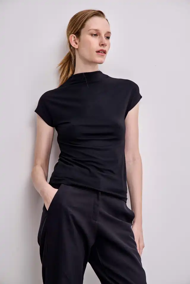 Prenda realizada con género de punto, compuesta por 95% rayón 5% spandex. De silueta slim, es una prenda que no ajusta, pero el textil tiende a pegarse al cuerpo. Cuenta con un cuello media polera bajo y mangas que caen levente por la línea del hombro.
