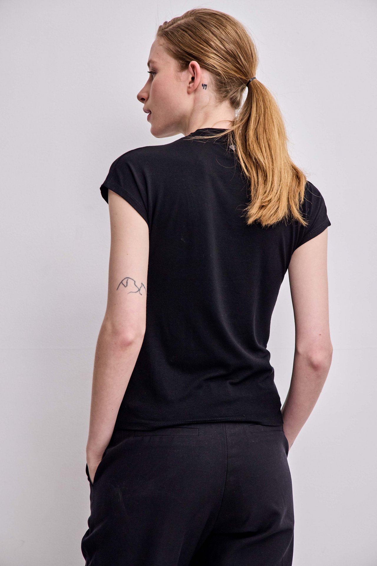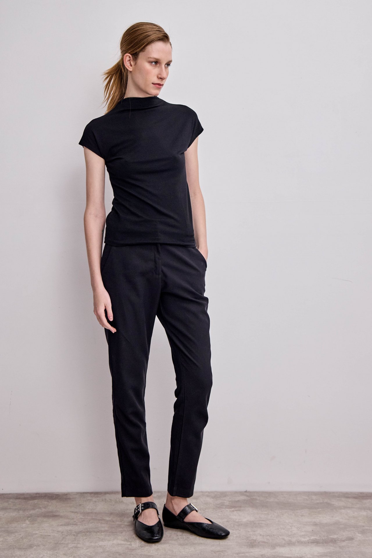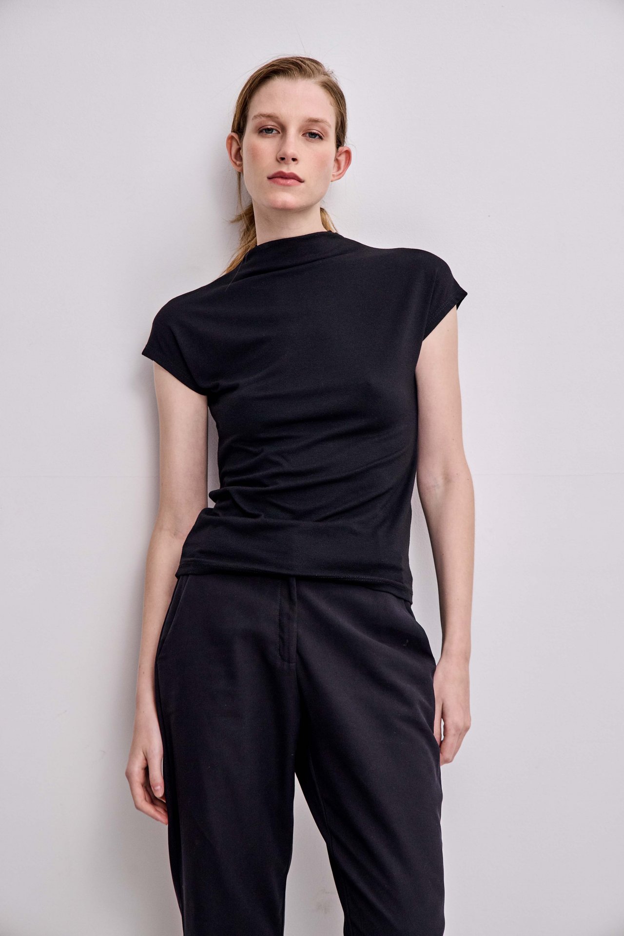 Prenda realizada con género de punto, compuesta por 95% rayón 5% spandex. De silueta slim, es una prenda que no ajusta, pero el textil tiende a pegarse al cuerpo. Cuenta con un cuello media polera bajo y mangas que caen levente por la línea del hombro.