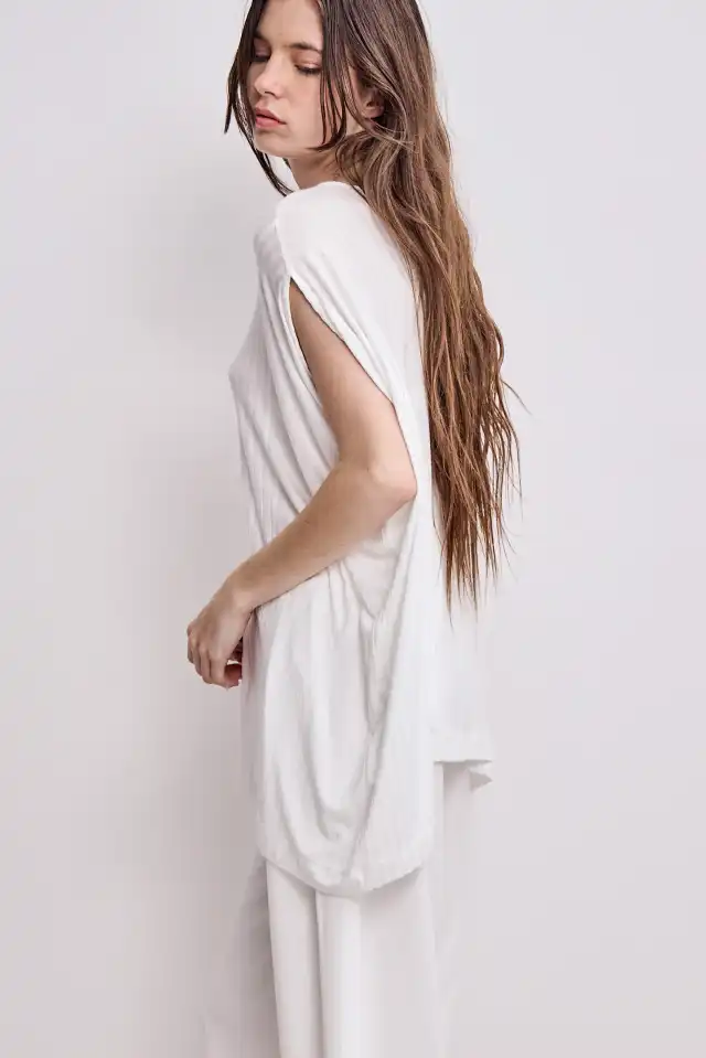 Remeron fabricado con género de punto morley 95% rayón 5% spandex. Su silueta es súper holgada, esta prenda viene en talle único ya que se adapta a todo tipo de cuerpo por su gran amplitud. De mordería cuadrada, esta prenda cae por la línea de hombro y forma unos picos laterales. Ideal para playa o dias calurosos.