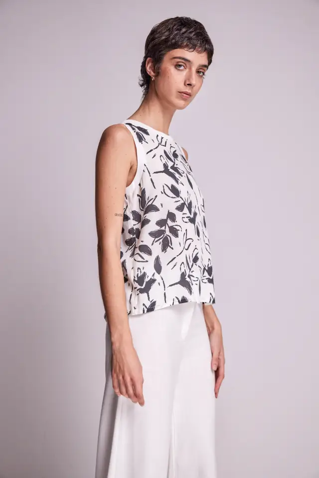 Top sin mangas escote redondo confeccionado en 100 % rayon. El modelo viene en una sola variante. Posee ribb en su escote y sisas. El largo total de hombro a ruedo es de 60 cm en talle 2.