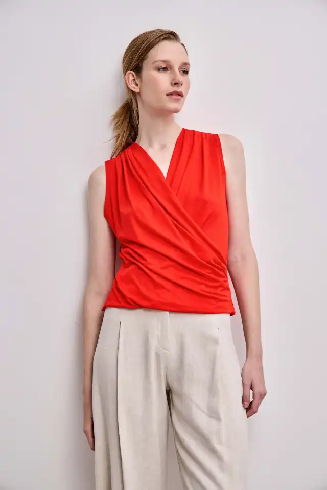 REMERA FABRICADA CON GENERO DE PUNTO COMPUESTO POR 95% VISCOSA 5% SPANDEX. REMERA MUSCULOSA CON ECOTE EN V CRUZADO. CON UN DRAPEDO EN EL LATERAL. SI BIEN LA PRENDA CUENTA CON UNA SILUETA SLIM, NO DE ADHIERE AL CUERPO, EN EL FRENTE EL BUCHE DEL DRAPEADO DISIMULA EL ABDOMEN. EL TEXTIL ES LIVIANO. IDEAL PARA OCASIÓN DE USO DONDE SE NECESITE ESTAR ARREGLADA.