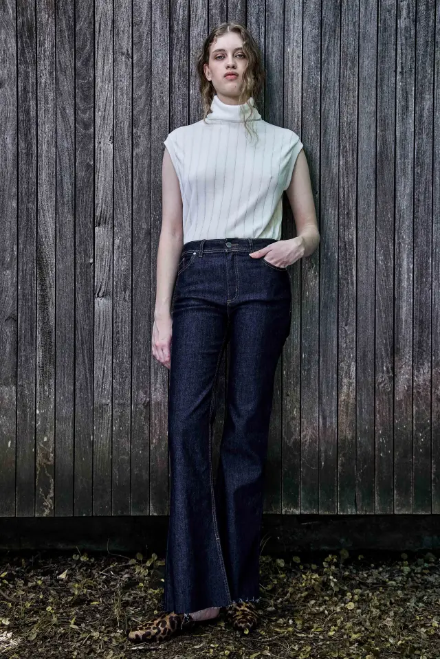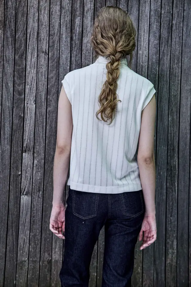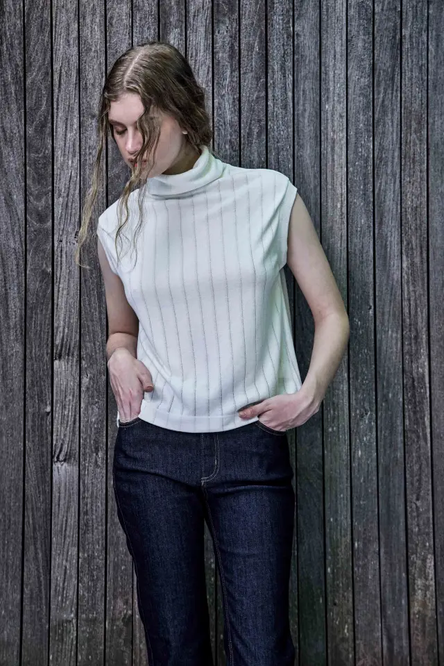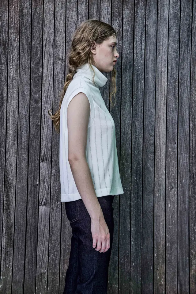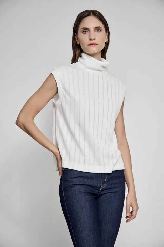 Prenda confeccionada con genero de punto compuesto por 85% viscosa 15% poliamida. De silueta regular, esta prenda no se adhiere al cuerpo. Chaleco musculosa, con puños pegados. Cuenta con un cuello polera doble, que cae por el peso de la tela, no ajusta el cuello. El textil imita al tejido y cuenta con un leve brillo generado por el lurex.